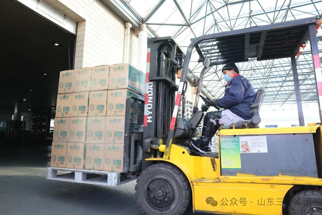》》在長壽花食品倉儲車間,叉車來回穿梭,緊鑼密鼓為客戶備貨。