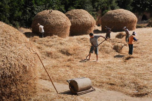 太陽剛露頭,打麥便開始了。將麥捆解開,均勻地鋪在場上,足有半尺厚。而后套上牲口,拉著石磙在麥子上轉(zhuǎn)圈。石磙“吱呀吱呀”地響,麥粒便從穗中脫落下來。孩子們最喜此時,光著腳丫在麥秸上奔跑嬉鬧,任憑麥芒扎得腳底板發(fā)癢,也不在乎。