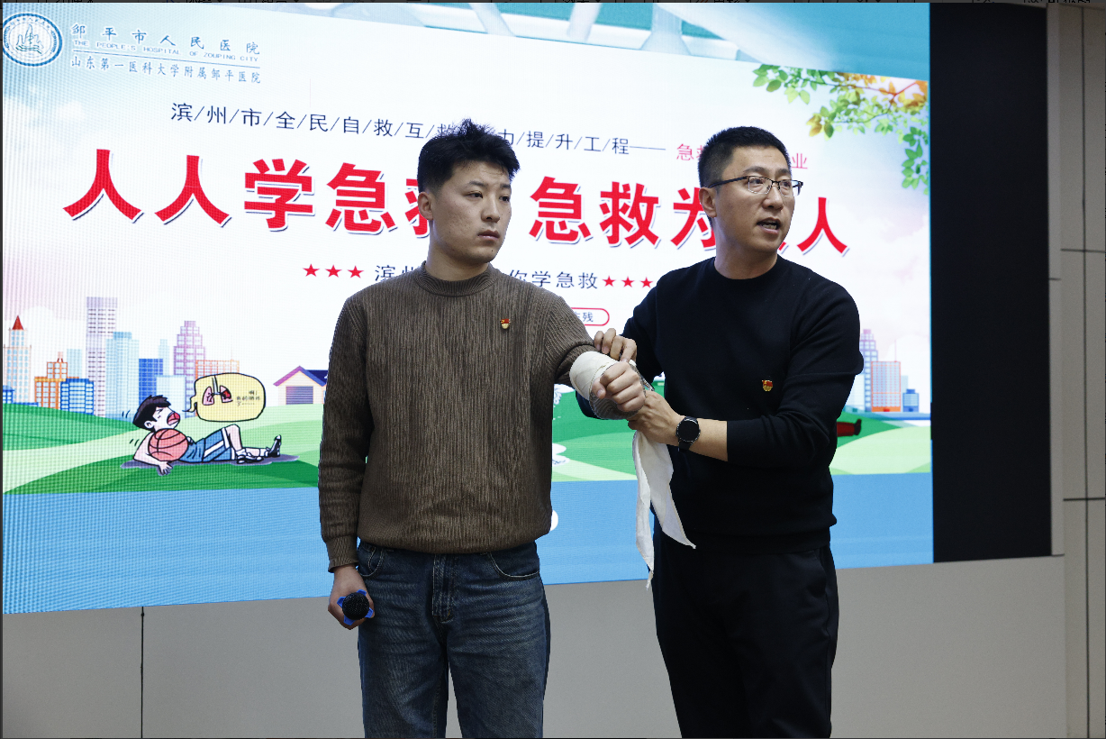 鄒平市人民醫(yī)院急診醫(yī)學(xué)科主任王曉通過播放案例視頻、應(yīng)急知識教學(xué)、現(xiàn)場操作演示等方式,借助模擬人、AED訓(xùn)練器、三角巾等教具,以細(xì)致、生動的講解,將心肺復(fù)蘇術(shù)、AED(自動體外除顫器)使用、海姆立克急救法及止血包扎技術(shù)等專業(yè)的醫(yī)學(xué)急救知識深入淺出地傳授給集團(tuán)員工。